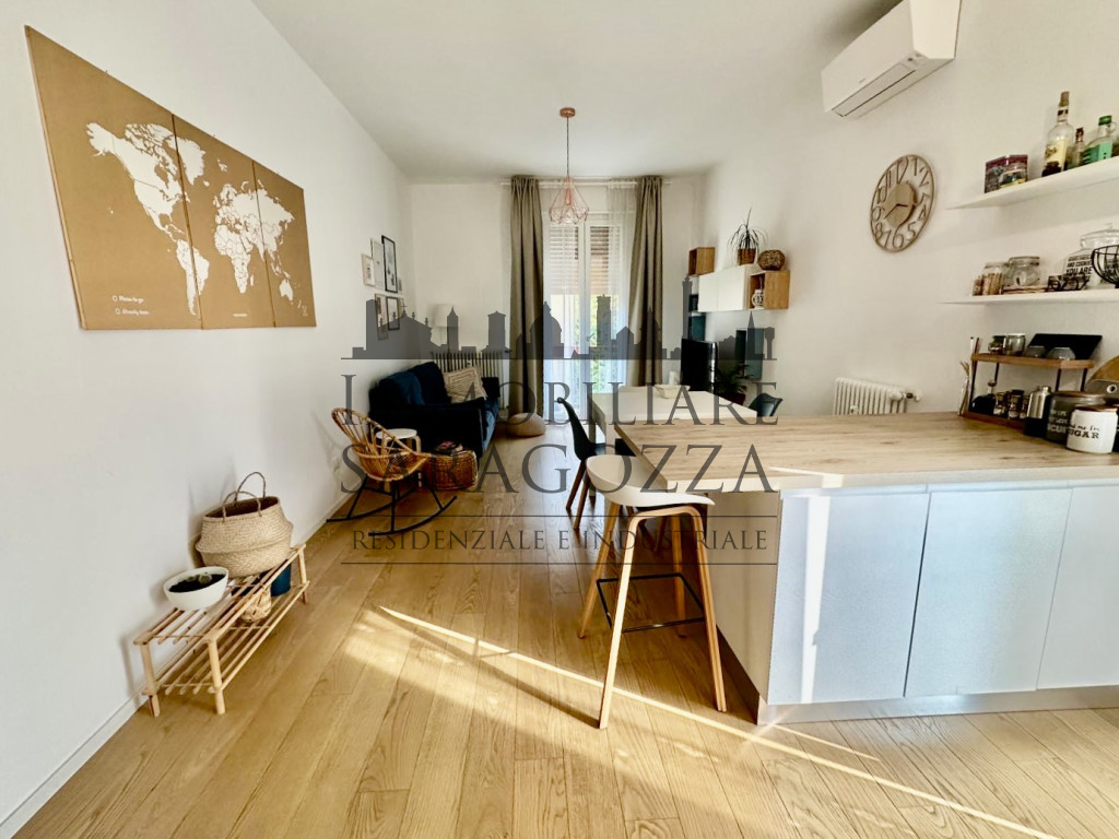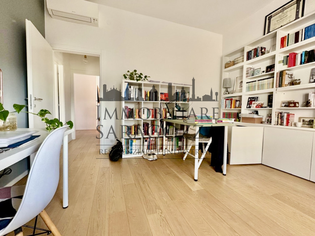 L’appartamento è situato al terzo piano con ascensore ed è composto da: ingresso su ampio salone open space con angolo cucina attrezzata, due camere da letto di grandi dimensioni, di cui una attualmente adibita a studio, bagno finestrato con doccia e ripostiglio.